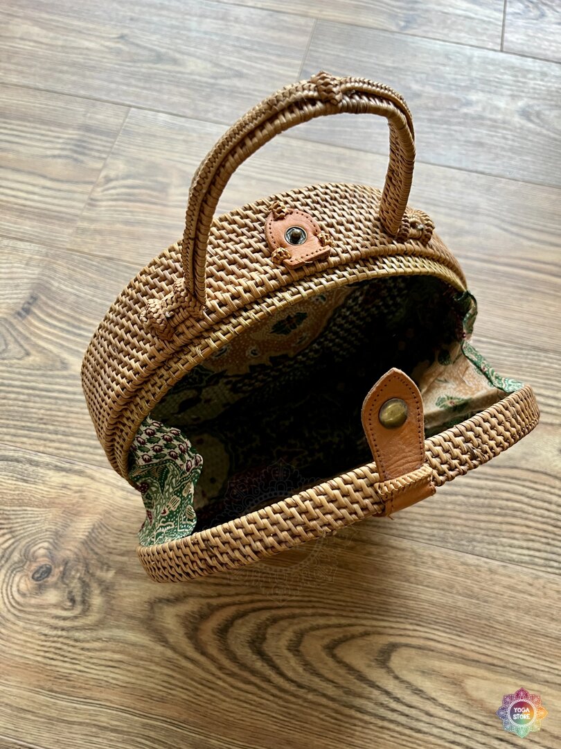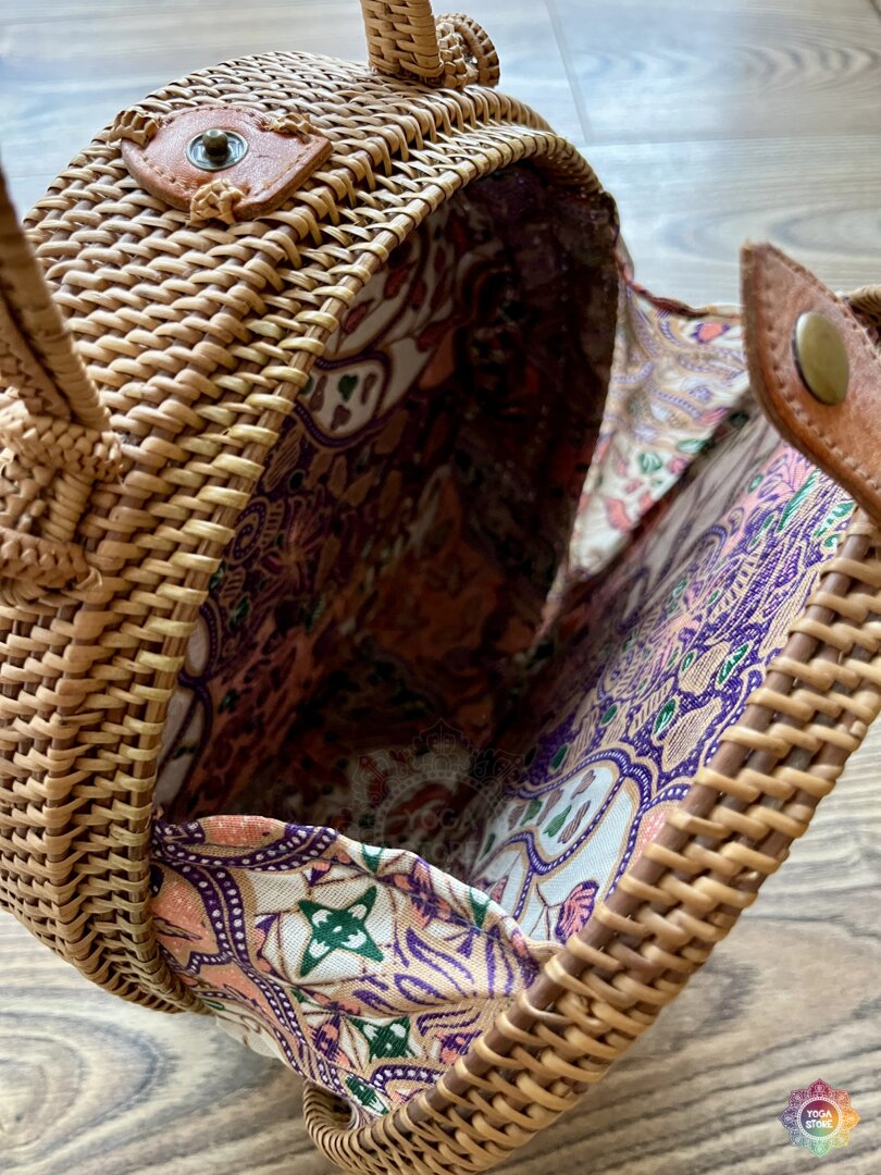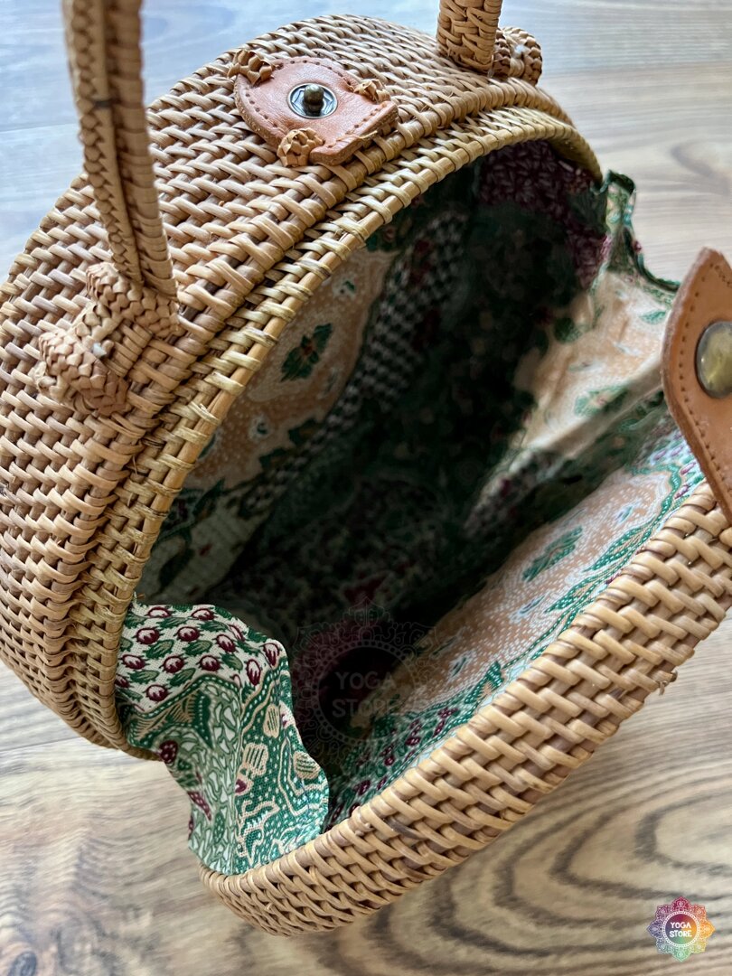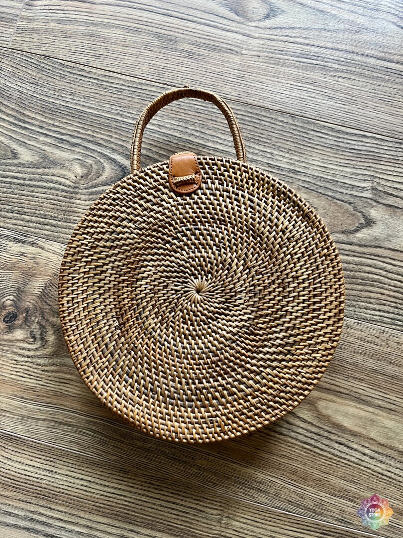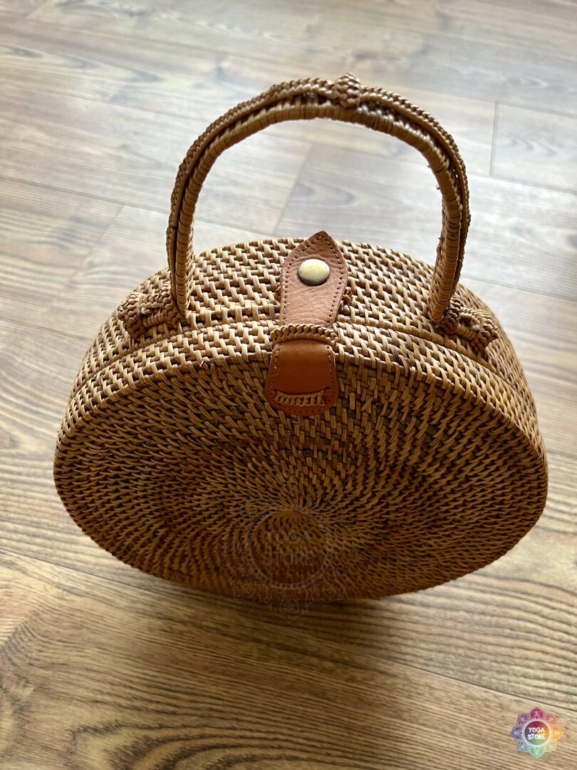 This round natural rattan handbag is a beautiful and stylish fashion accessory from Bali.