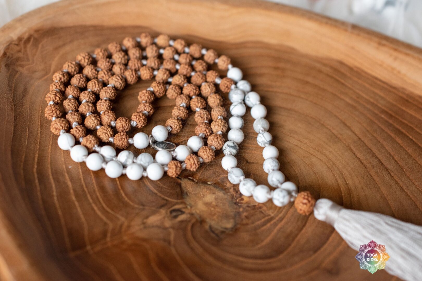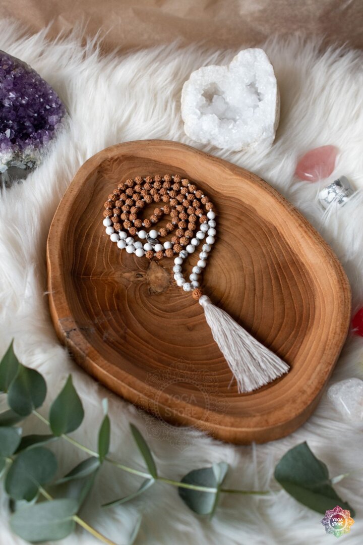 A handmade meditation mala necklace with magnesite and rudraksha.